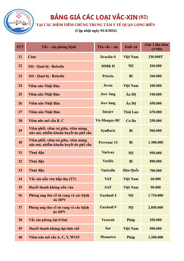ĐỊA ĐIỂM TIÊM VÀ GIÁ TIÊM VẮC XIN DỊCH VỤ TẠI TRUNG TÂM Y TẾ QUẬN LONG BIÊN TỪ NGÀY 01/4/2024