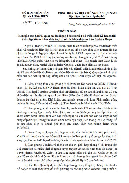Báo cáo tiến độ triển khai thí điểm lập Hồ sơ sức khoẻ điện tử, Sổ sức khoẻ điện tử trên địa bàn quận Long Biên