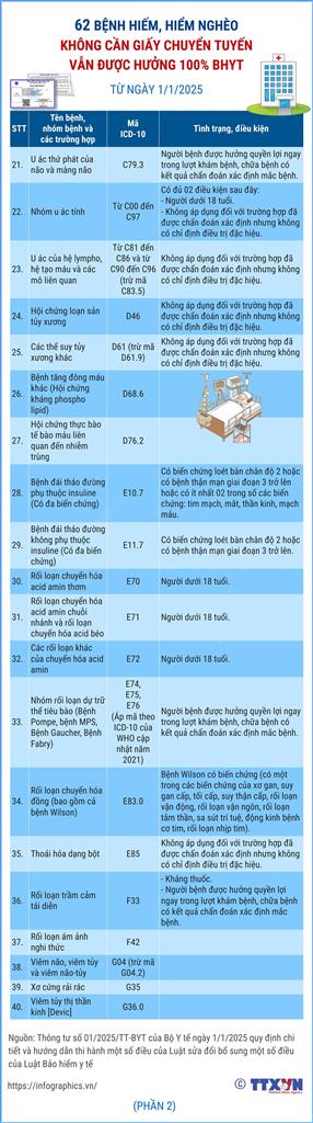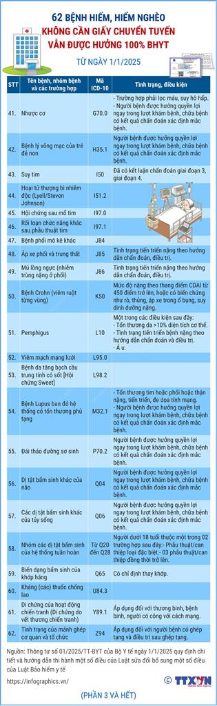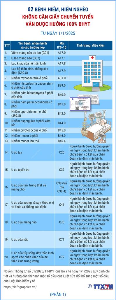 62 BỆNH HIẾM, HIỂM NGHÈO KHÔNG CẦN GIẤY CHUYỂN TUYẾN VẪN ĐƯỢC HƯỞNG 100% BẢO HIỂM Y TẾ TỪ NGÀY 01/01/2025.