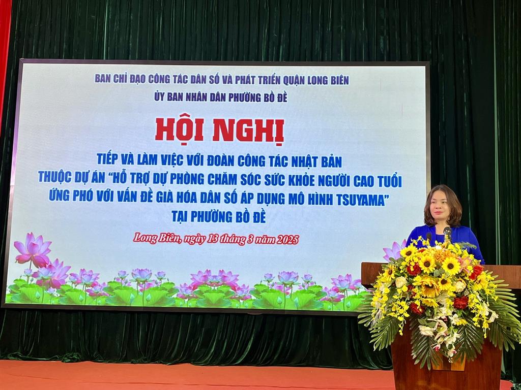 Thực hiện công văn số 17/CDS-NCT ngày 10/01/2025 của Cục Dân số về việc chuẩn bị các nội dung làm việc với Đoàn công tác Nhật Bản tháng 3 năm 2025, sáng ngày 13/3/2025, Trung tâm Y tế quận Long Biên phối hợp với UBND phường Bồ Đề tổ chức hội nghị tiếp và làm việc với đoàn công tác Nhật Bản thuộc dự án "Hỗ trợ dự phòng chăm sóc sức khoẻ người cao tuổi ứng phó với vấn đề già hoá dân số áp dụng mô hình Tsuyama" giai đoạn 2022 - 2025.