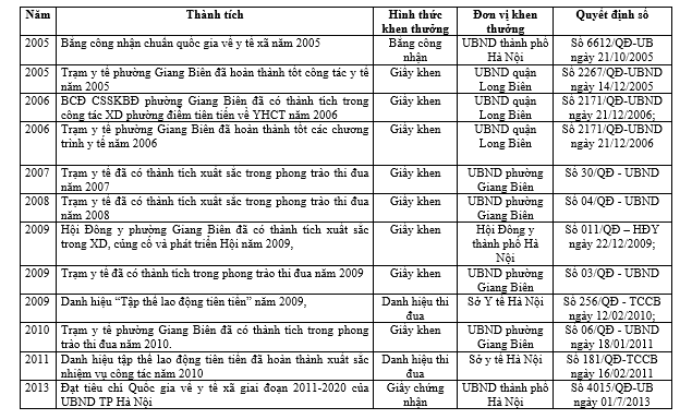 Năm 2012, trạm y tế phường Giang Biên đã đạt được 10 tiêu chí chuẩn quốc gia giai đoạn 2011 – 2020 và duy trì phường đạt tiêu chí quốc gia về y tế giai đoạn đến 2030