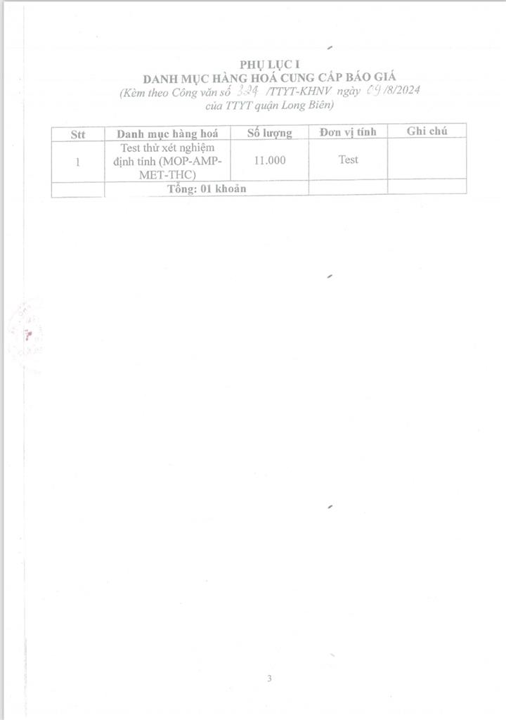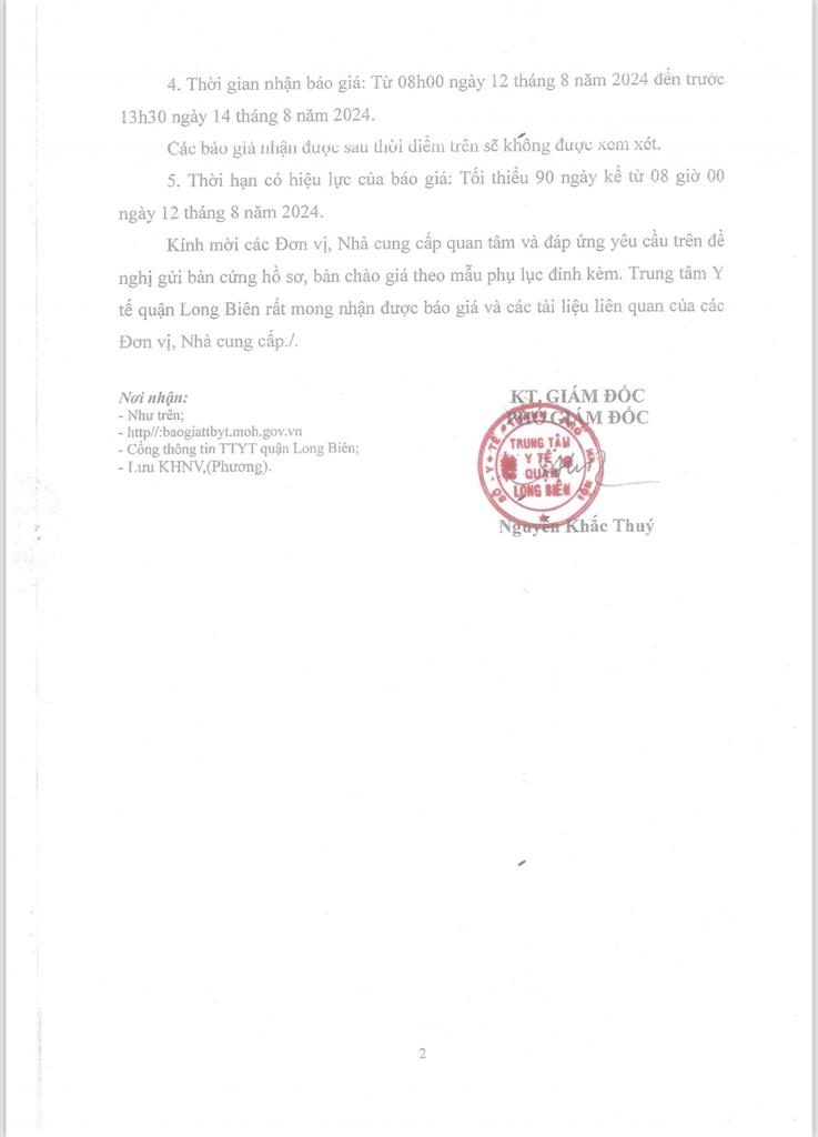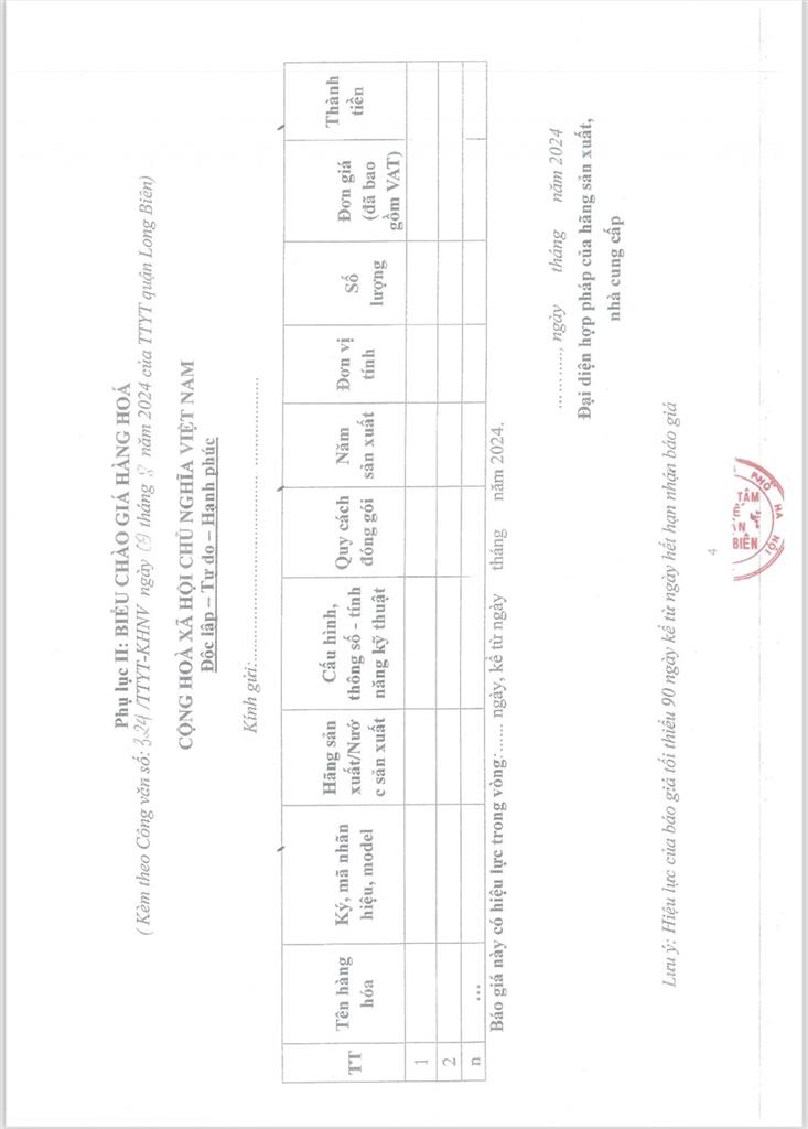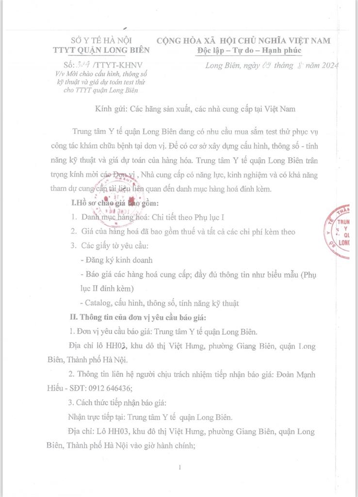 VỀ VIỆC MỜI CHÀO CẤU HÌNH, THÔNG SỐ KỸ THUẬT VÀ GIÁ DỰ TOÁN TEST THỬ CHO TTYT QUẬN LONG BIÊN