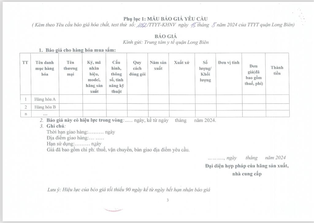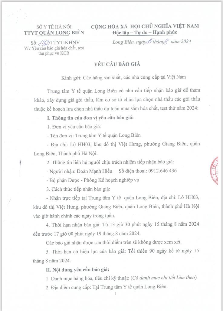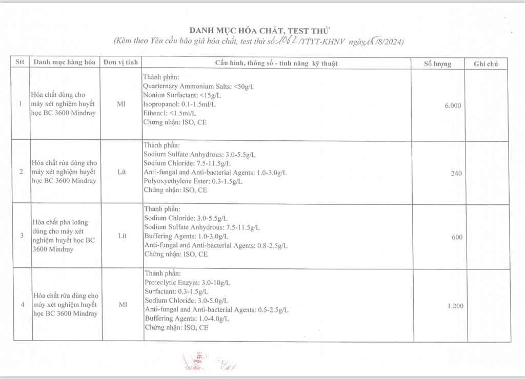VỀ VIỆC YÊU CẦU BÁO GIÁ HOÁ CHẤT, TEST THỬ PHỤC VỤ KHÁM CHỮA BỆNH