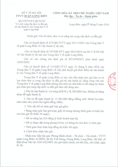 V/V MỜI CUNG CẤP DỊCH VỤ ĐẤU GIÁ TÀI SẢN THANH LÝ CỦA TRUNG TÂM Y TẾ QUẬN LONG BIÊN